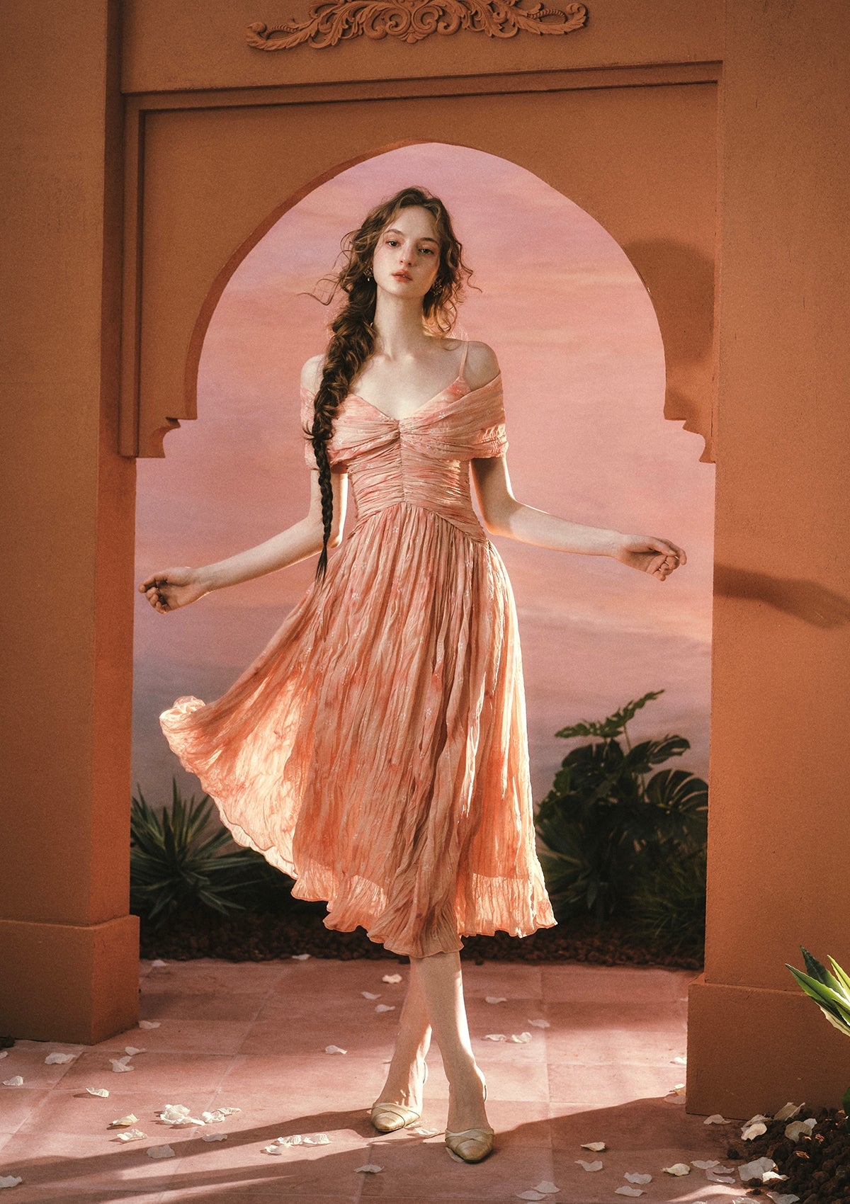 A full, textured skirt in a crinkled fabric offers airy volume and graceful movement.